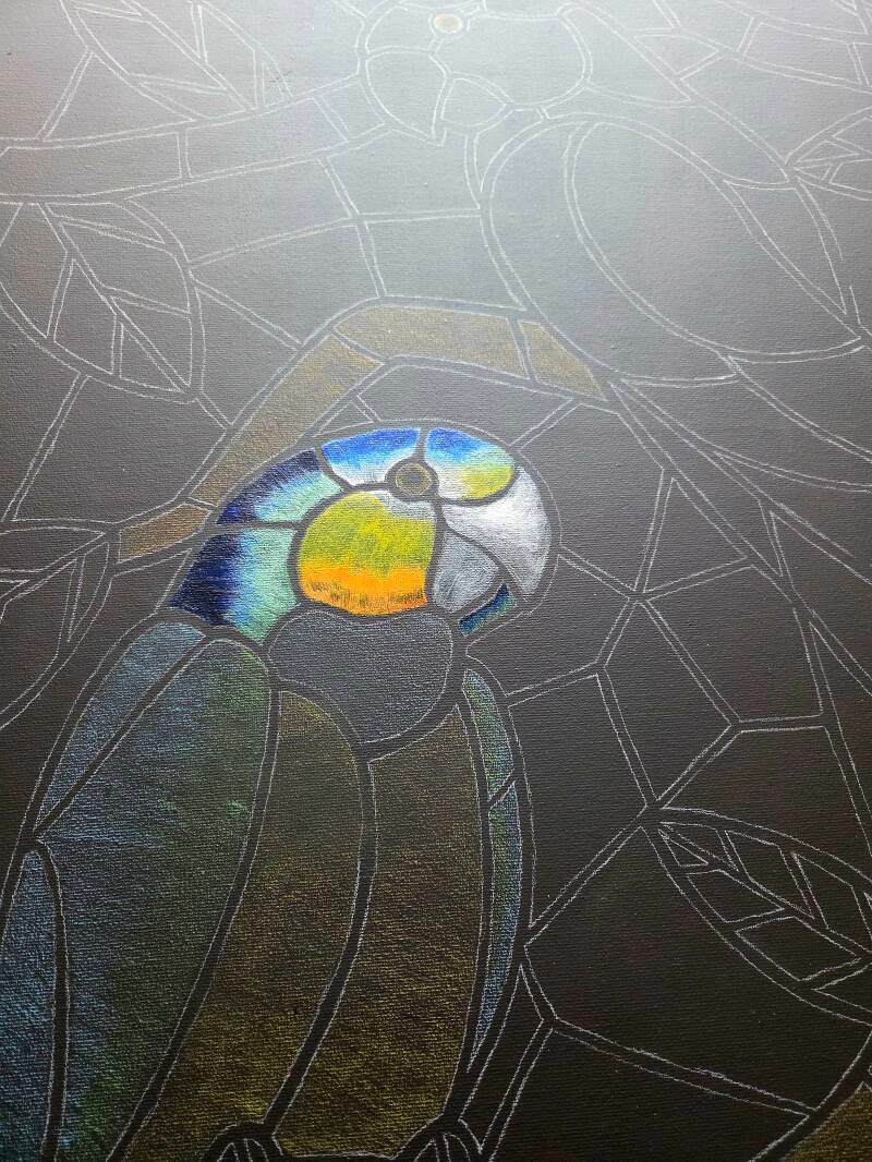 Weer een stukje verder. De rode papagaai is zo goed als klaar, alleen het oog nog. De blauwe papagaai schiet ook al op. Dan komt daarna het meeste maar ook saaie werk. De omgeving.