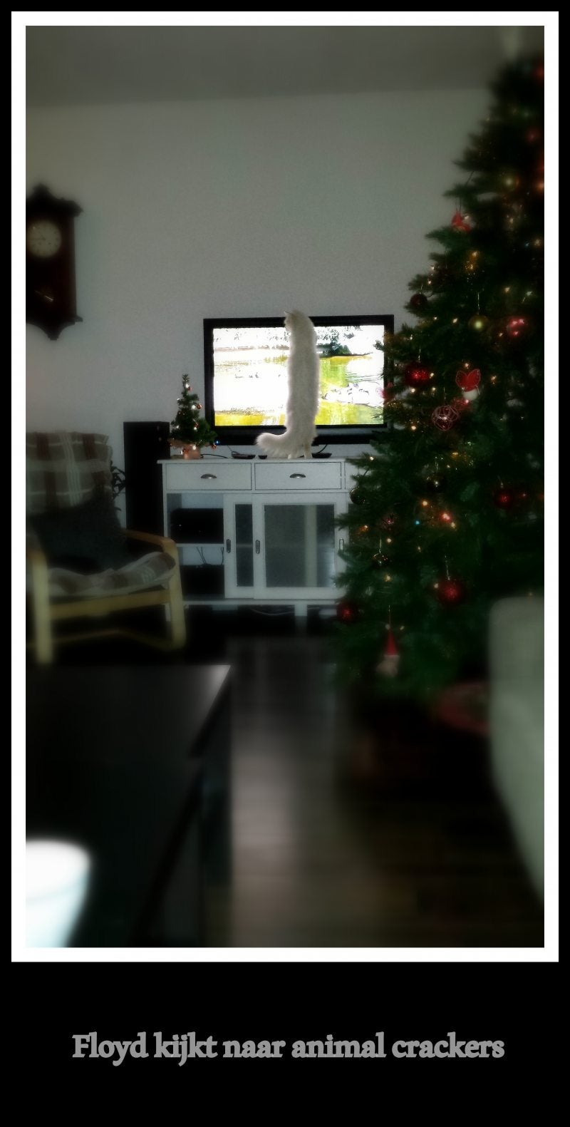 En met dat ik dit schrijf schrikt 1 van de katten, rent weg, blijft haken aan een snoertje, trekt mijn zeer moeilijk opgehangen kerstslinger van het raam, schrikt en met haar ook de anderen, nemen in paniek de kerstslinger mee, langs de boom, die begint zeer gevaarlijk te wankelen, ze schrikken nog harder en nu niet meer alleen zij.
