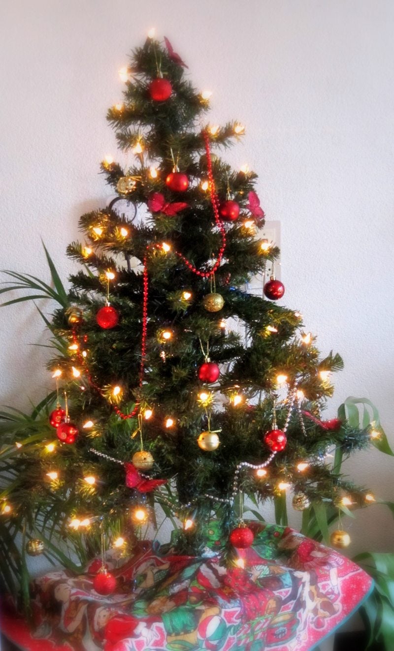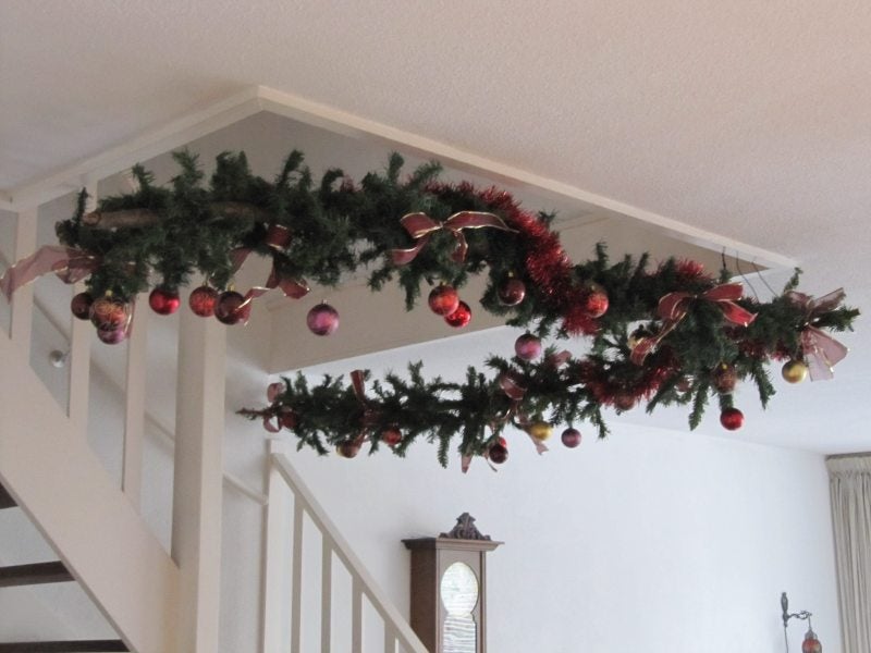 Toen de takken hingen mocht ik met het versieren beginnen. Als eerste de kunststof ballen en daarna de rode guirlande en de strikken.