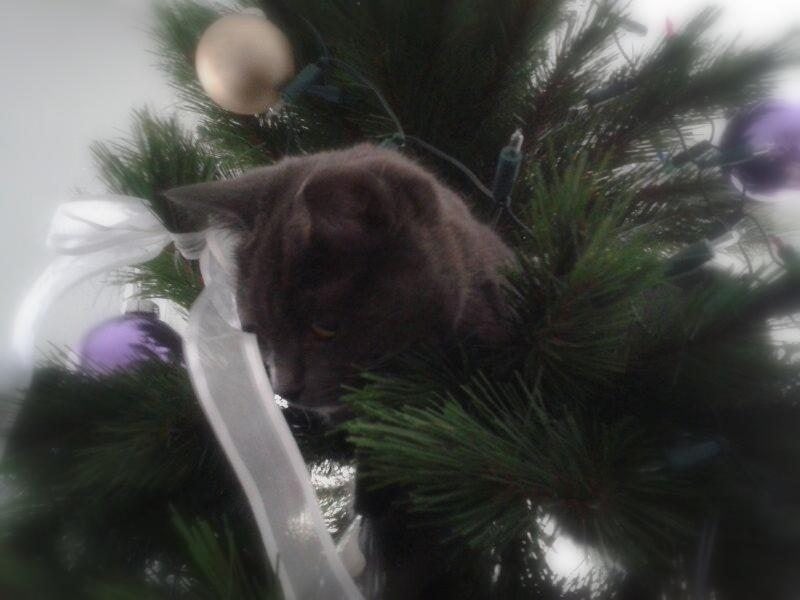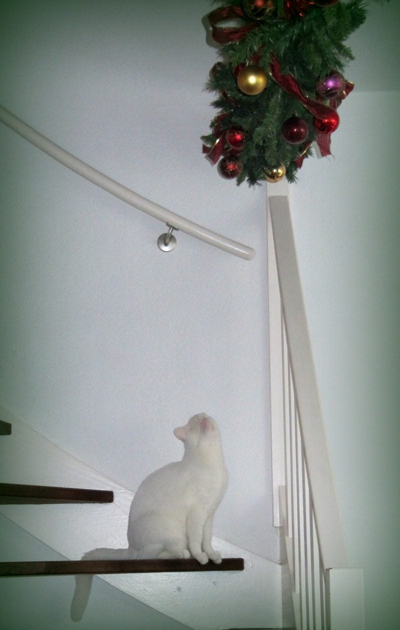 In de boom hebben we nu kerstbelletjes. Dat is enorm handig want ik hoor nu gelijk als ze bezig zijn met de boom. De kerstman werd beslopen maar Floyd had al gauw door Dat er niets te vrezen was en ging pontificaal op zijn bureau zitten. Mocht ook niet-straal water.