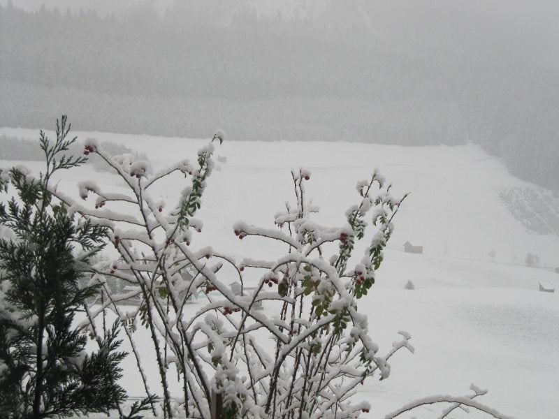 Vanmorgen werden we wakker door Jip. Om zeven uur (zucht) wilde ze wel eventje naar buiten. Toen ik de gordijnen open deed zag ik dat het heel hard sneeuwde. We zagen de bergen niet meer. nadat ze allebei geplast hadden ben ike r nog lekker even terug gegaan maar slapen....tja, dat lukte niet meer. Dan maar gezellig met de honden knuffelen.