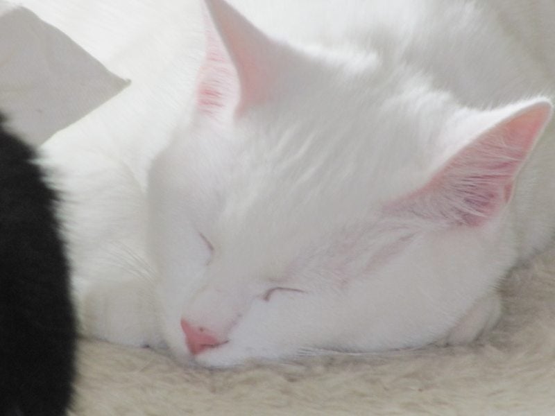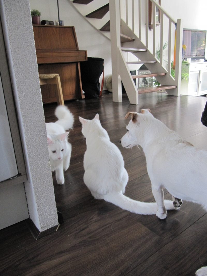 Thuis gingen ze gelijk uit de box en hadden ze gelijk de confrontatie met de honden. En.....er gebeurde niets. Anouk pompte zich wel wat groter maar toen Yeti dat ook deed was de lol er al gauw vanaf. Anouk volgde Yeti overal en Yeti deed net of ze niet bestond. Na een half uur gaf Anouk het op en gingen ze allebei slapen.