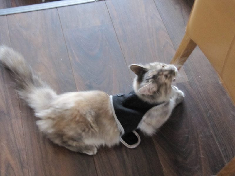 Vanmorgen had Floyd een plastic zakje gepikt van de ontbijttafel waar smeerleverworst in zat. Op de grond werd het heerlijk opgepeuzeld, Muisje mocht ook af en toe een likje maar verder mocht niemand iets hebben, ook de honden niet. Het is dus heel duidelijk wie hier de baas is. En dat al met vier maanden.