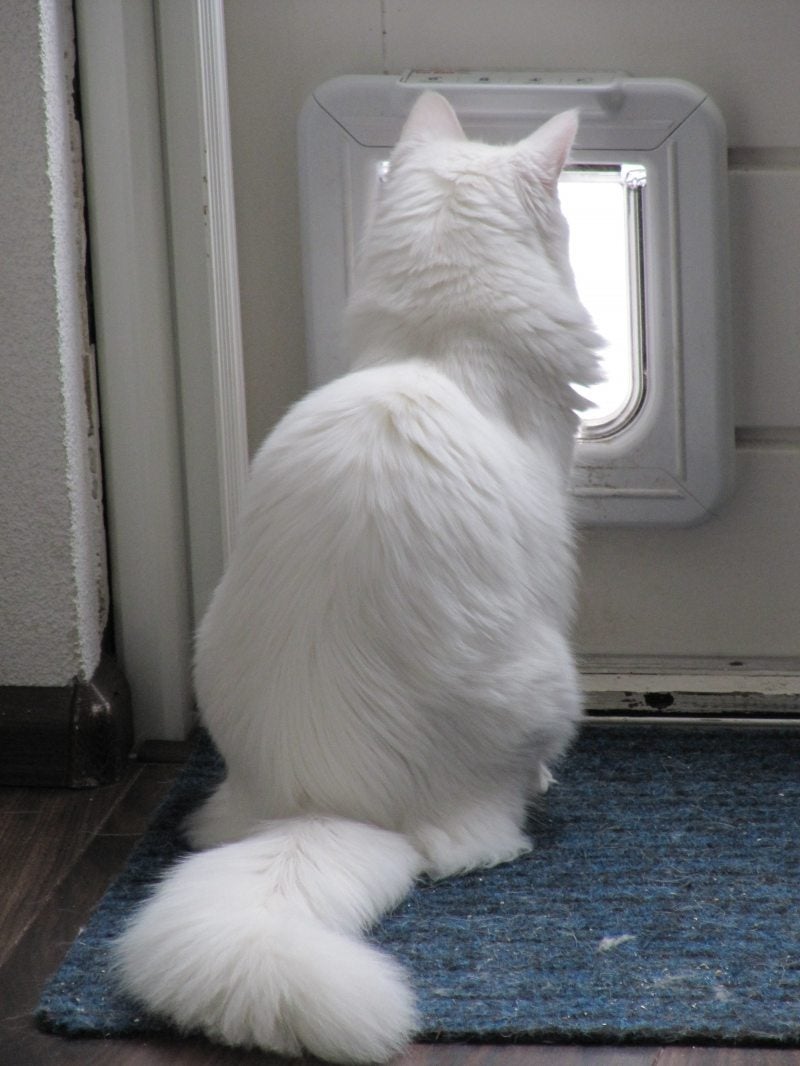 Kitty vindt het berghok veeeeel te koud dus miauwt de hele boel bij elkaar om duidelijk te maken dat ze echt binnen op de vensterbank, in het zonnetje, boven de verwarming wilt liggen.