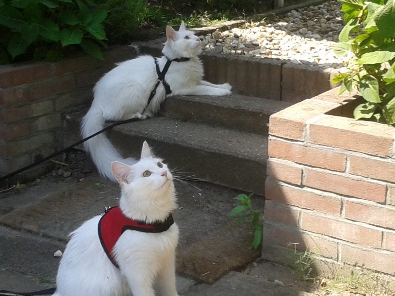 Ik vond het wel eng om ze alleen buiten te laten dus bij bezoek aan toilet of het maken van de lunch ging het in de derde versnelling. En dat was maar goed ook want het lukte Houdini-Broke om uiteindelijk uit haar tuig te kruipen.