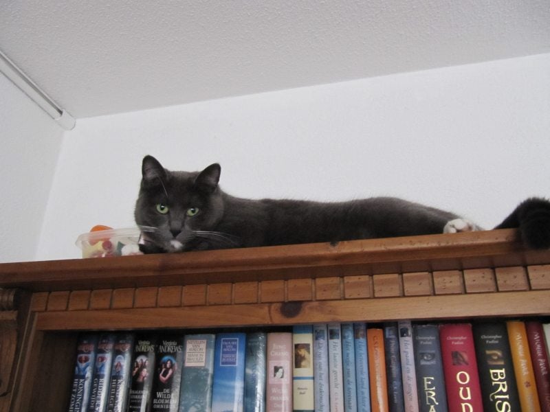 Ik kan het me namelijk zo goed voorstellen. Zit je lekker in het zonnetje want achter het glas is het heerlijk. Moeten de kinderen er ook weer bij. Heb je een slaapplek boven op de boekenkast gevonden. Het is een goed strategisch plekje. Je kan alles in de gaten houden en je wordt niet opgemerkt. Weet 1 van de kinderen je weer te vinden en komt dan "gezellig" naast je liggen, zucht. Je vind ze lief hoor en je blijft toch bezorgt om die twee want als er een noodkreet komt dan ben je er als eerste bij, maar laat mij nou even.