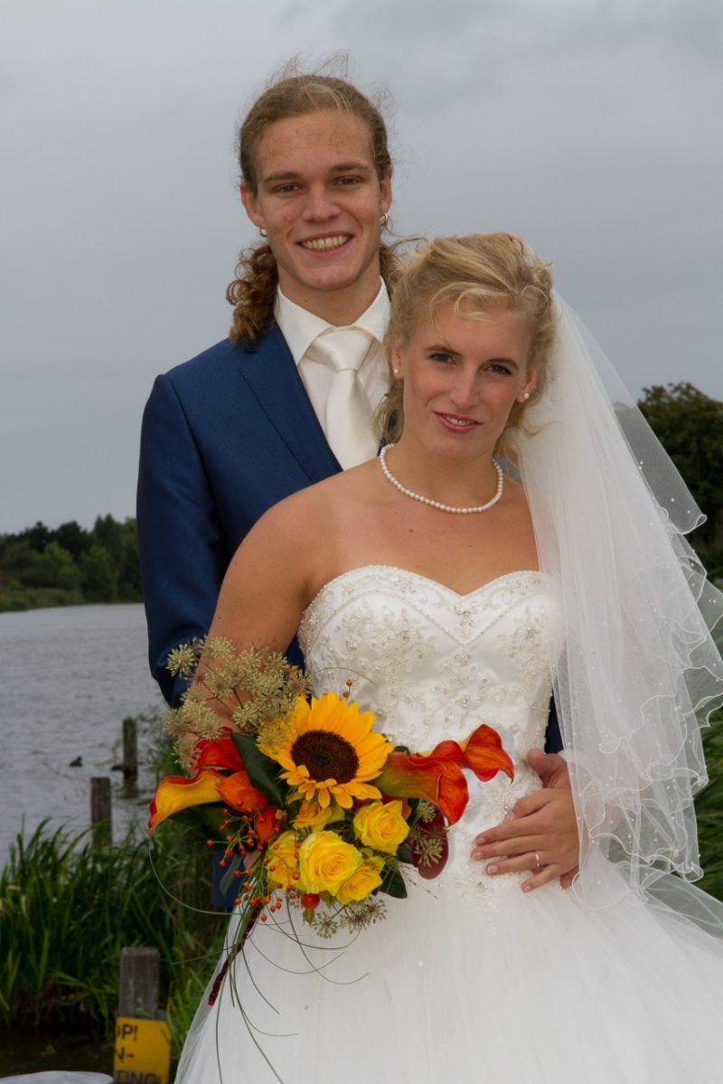 Afgelopen vrijdag hebben we de trouwerij van Inge en Bas gehad. Wat was dat een feestdag. We hebben echt van 's Ochtends 6 uur tot 2.30 uur genoten. Om kwart over zeven waren we al bij de kapster. Zij zette ons gelijk in de carmenrollers. Daarna werd Lianne gekapt en Inge ging met rollers naar huis. Ik bleef achter en reed later met Jose de kapster mee. Thuis kon Ellen gelijk beginnen met make-up. Daarna naar boven en werd Inge in haar fantastische jurk gehesen. Ondertussen gingen Lianne en ik ook ons mooie pakkie aantrekken. Rond tienen was Bas en zijn familie er en kon het feest beginnen. Zij gingen foto's maken. Wij bleven achter voor de koffie en de laatste handelingen. Om twaalf uur stroomde het huis vol. Iedereen voorzien van brood en konden we om half 1 vertrekken naar de vreemde vogel. Daar aan gekomen stonden er al heel veel mensen te wachten. Dat is zo leuk en hartverwarmend. De plechtigheid was mooi en indrukwekkend. Het begon ook nog even te regenen en net bij het ja woord brak de zon door. Je kan veel regelen maar dit moet je uit handen geven en dan is het toch wel een prachtig cadeau.