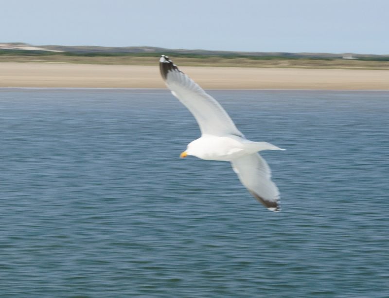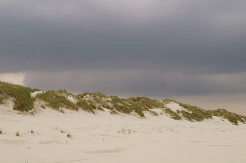 We besloten maar om onderaan de duinen in het gras te zitten, knieën tegen ons aan en maar wachten wat er gaat gebeuren. De bui hoorden we steeds dichterbij komen. De lucht werd alsmaar zwarter en zwarter. Ik vond het eerlijk gezegd niet leuk. Ik ben niet bang voor onweer maar ben wel graag binnen. Ik heb wel veel ontzag voor dit natuurgeweld.