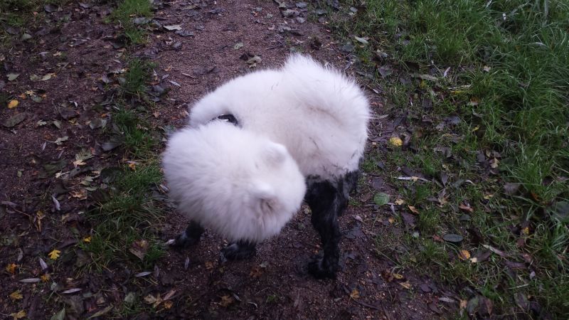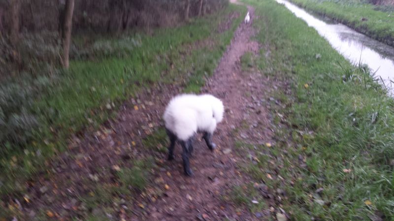 De onderkant was verandert van smetteloos wit naar diepzwart.En vond hij het vies en raar. Hij liep maar te schudden en te slaan met zijn poten. Maar dat spul is zo stroperig. Dat krijg je echt niet zo er van af.Bij het lopen ging al aardig wat bagger er van af en met name bij zijn voeten. Maar er bleef genoeg over om in bad te gaan.