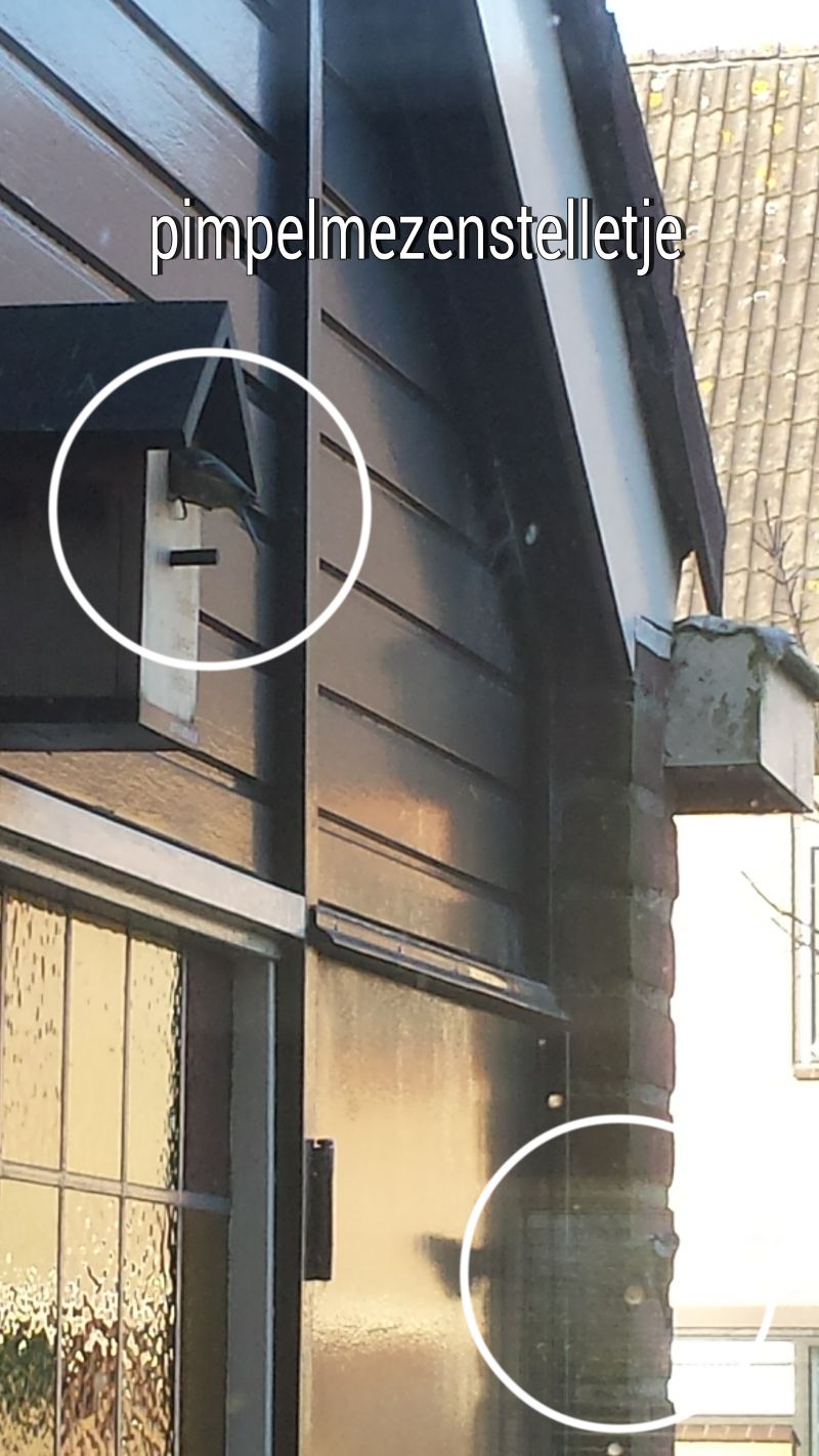 Een maand geleden wilde weer een pimpelstelletje en kans wagen en waren al druk bezig met inspecteren. Overnachten prima maar niet een gezin stichten. Dus werd het huisje weggehaald en in de voortuin gehangen. Lekker hoog zodat de kleintjes de kans hebben om in de boom of struik te komen. En onze katten komen niet in de voortuin.